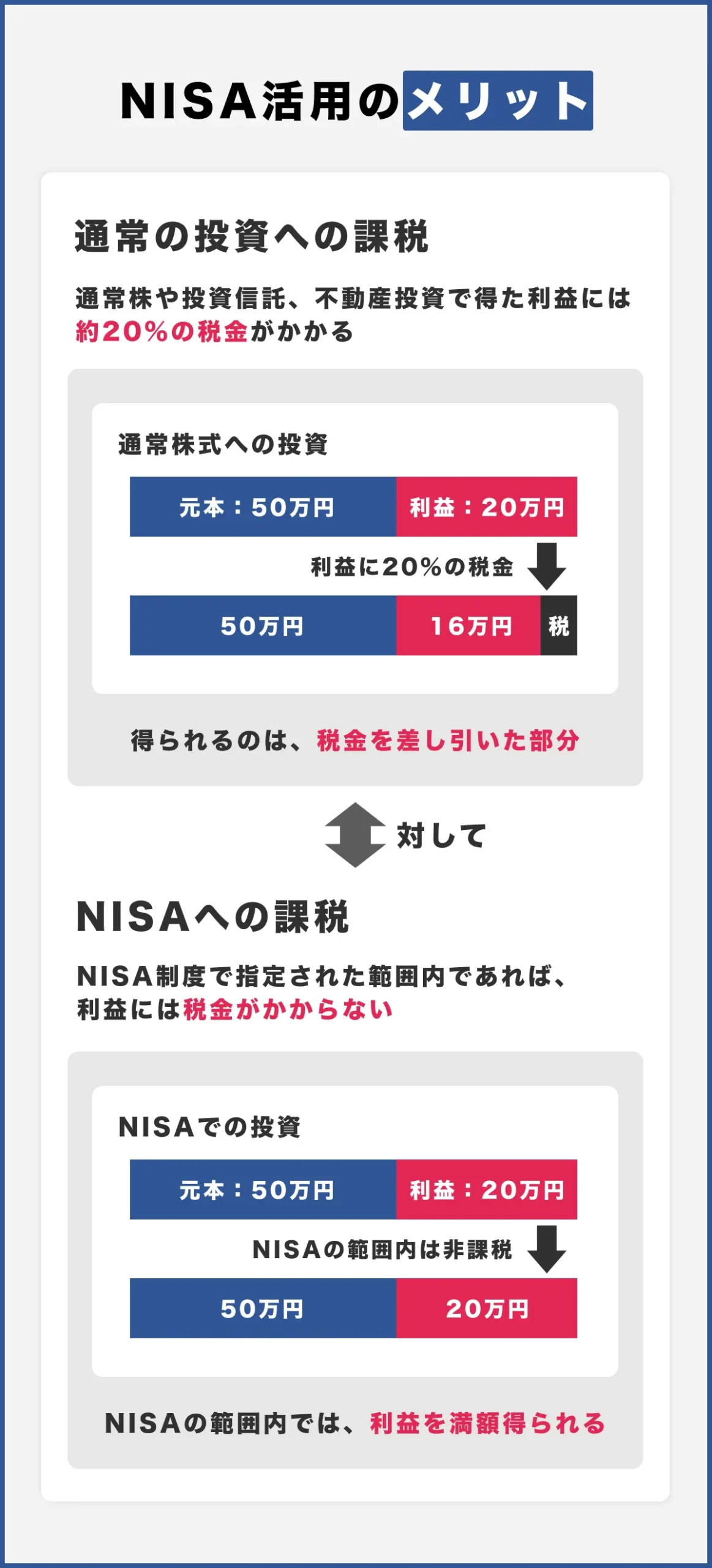 通常株や投資信託、不動産投資で得た利益には約20%の税金がかかりますが、NISAの範囲内であればそれが非課税になります。