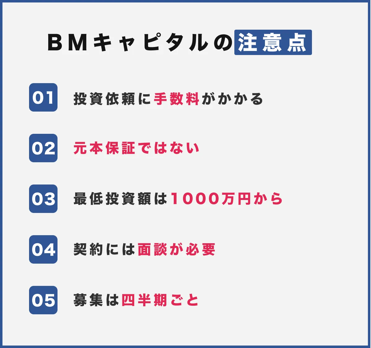 BMキャピタルへの投資/出資は原則「1000万円から」です。一般的な(公募の)投資信託のように、気軽に手が届くものではない点には注意が必要です。