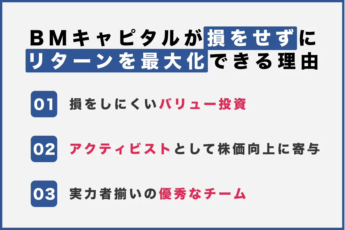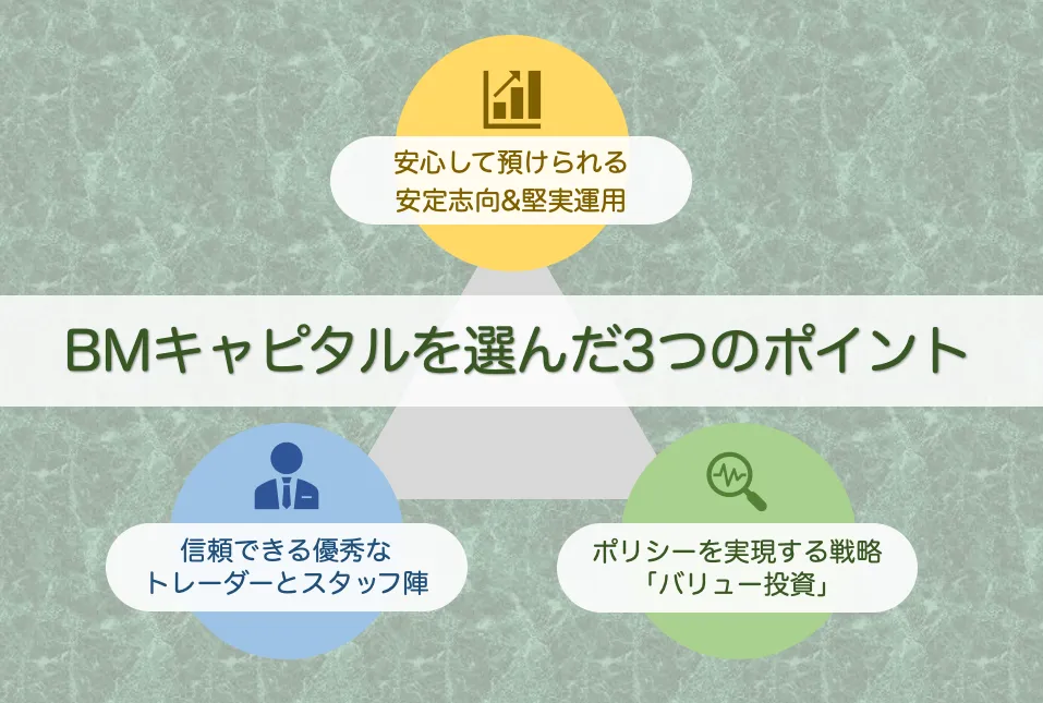 なぜBMキャピタルがこのような投資成果をあげているのかは、BMキャピタルの特徴(運用方針や投資戦略)や投資手法の面から解説していきます。