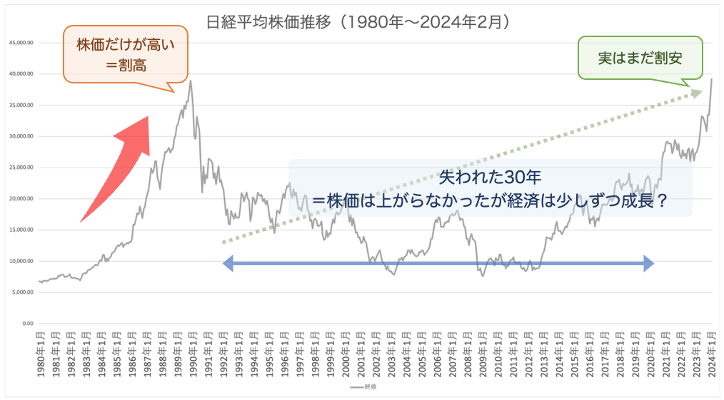 失われた30年と言われた1990年代〜2010年代にかけて株価はほとんど上がりませんでしたが、その間も少しずつ経済は成長してきています。不況・不景気と言われ続けていたものの、30年前と今とで世の中が大きく違うのは実感しているはずです。