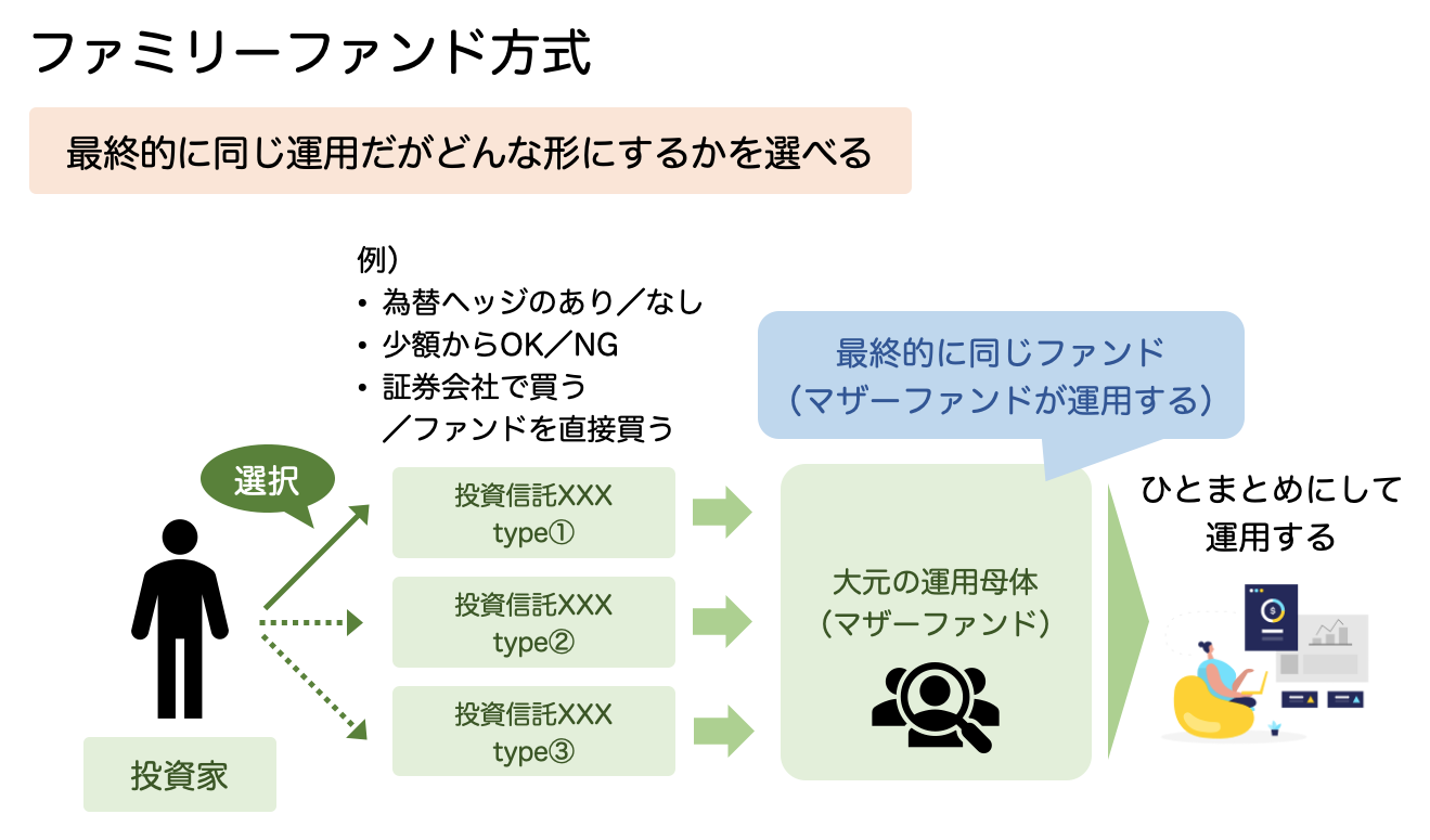 ファミリーファンド方式にすることで、ファンド側は様々な商品(販路)を通じて資金を調達しマザーファンドの規模を大きくすることができます。