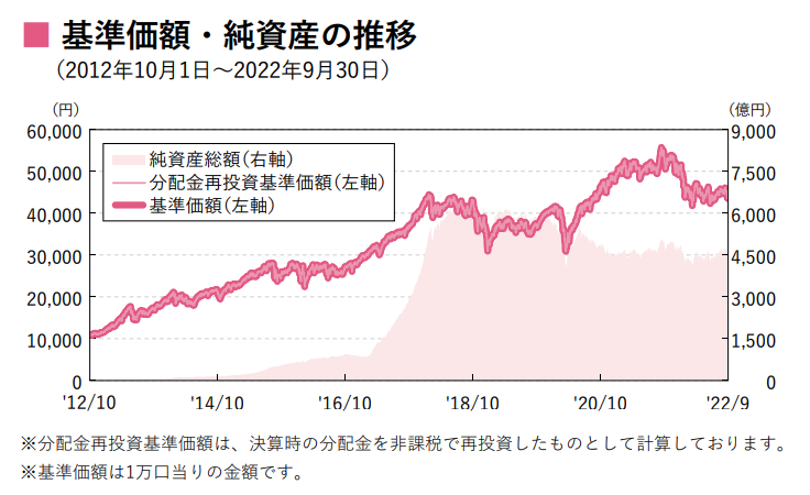投資家からの人気はも高く、純資産総額も2016年頃から跳ね上がっており、2017年に1,000億円を超えてからは一気に規模を拡大し、一時は6,000億円を突破するほど人気がありました。