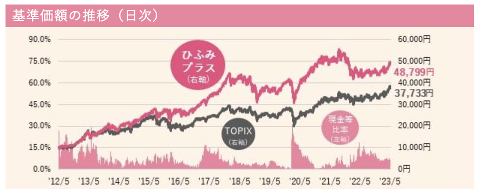 ひふみプラスは、2012年の設定以来、基準価額は上がり続けており、2023年5月時点の基準価格は48,799円と、約4.9倍になっています。10年に渡って堅調に推移しており、実績が十分にあるファンドであると言えるでしょう。