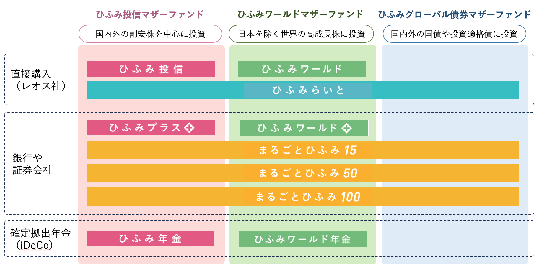 ひふみ(レオス社)のHPを見ると、購入場所ごとにグループ分けされていますが、実はそれ以外にも特徴や共通するポイントがあります。詳しく見ていきましょう。