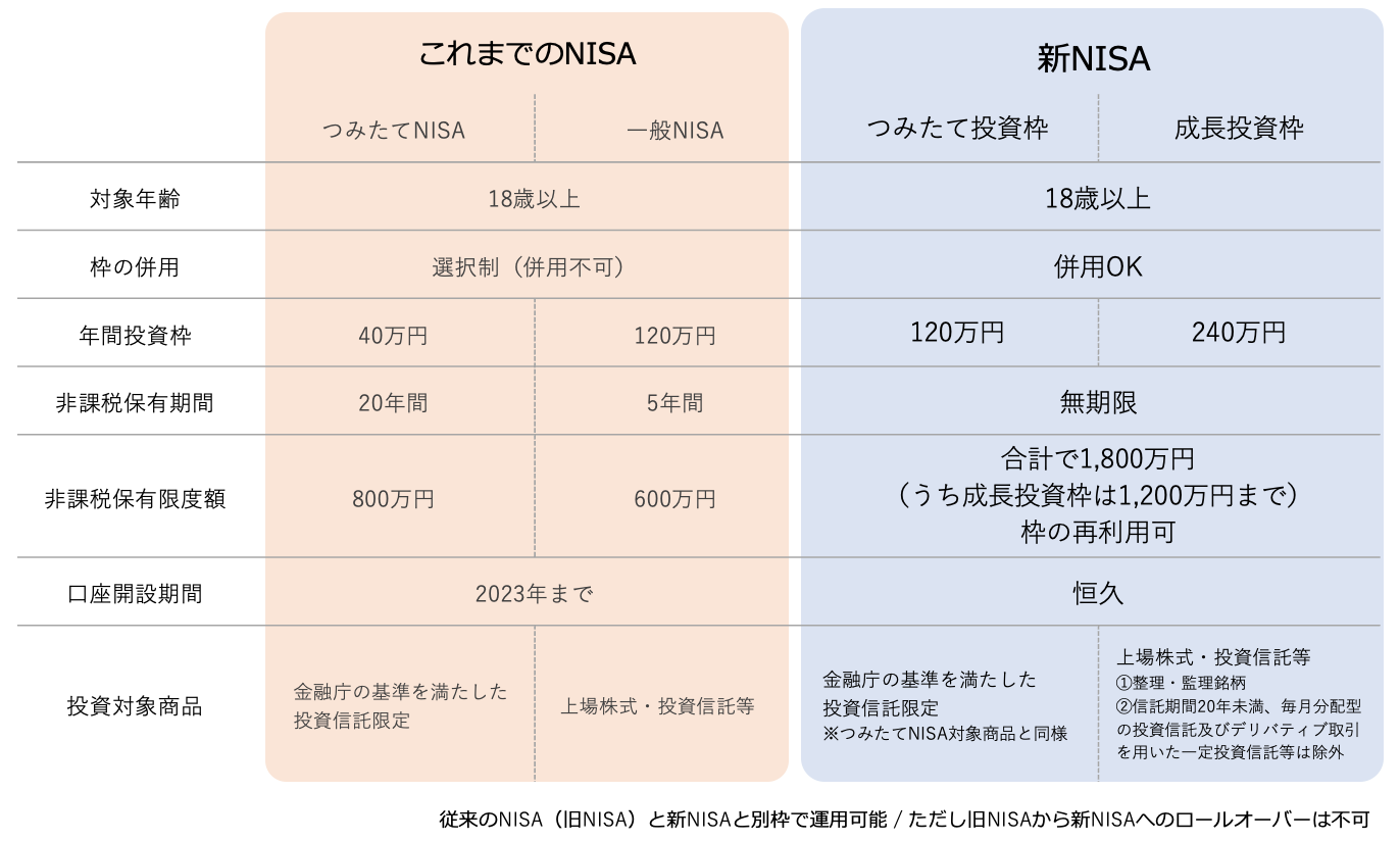 従来の制度では、NISAを活用できる期間に制限がありましたが、2024年に制度改正し、無期限に運用できるようになりました。また、従来選択制になっていた「つみたてNISA」と「一般NISA」の部分が「つみたて投資枠」「成長投資枠」という形になり、併用して利用することも可能になりました。