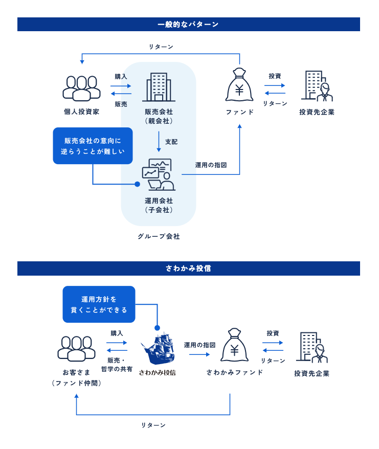 一方のさわかみ投信は、さわかみファンドが国内外の株式や債券などの有価証券に直接投資をするため、株主総会などで議決権を行使できるといった、他のファンドを介在していては実現できない、より能動的な投資が可能になります。