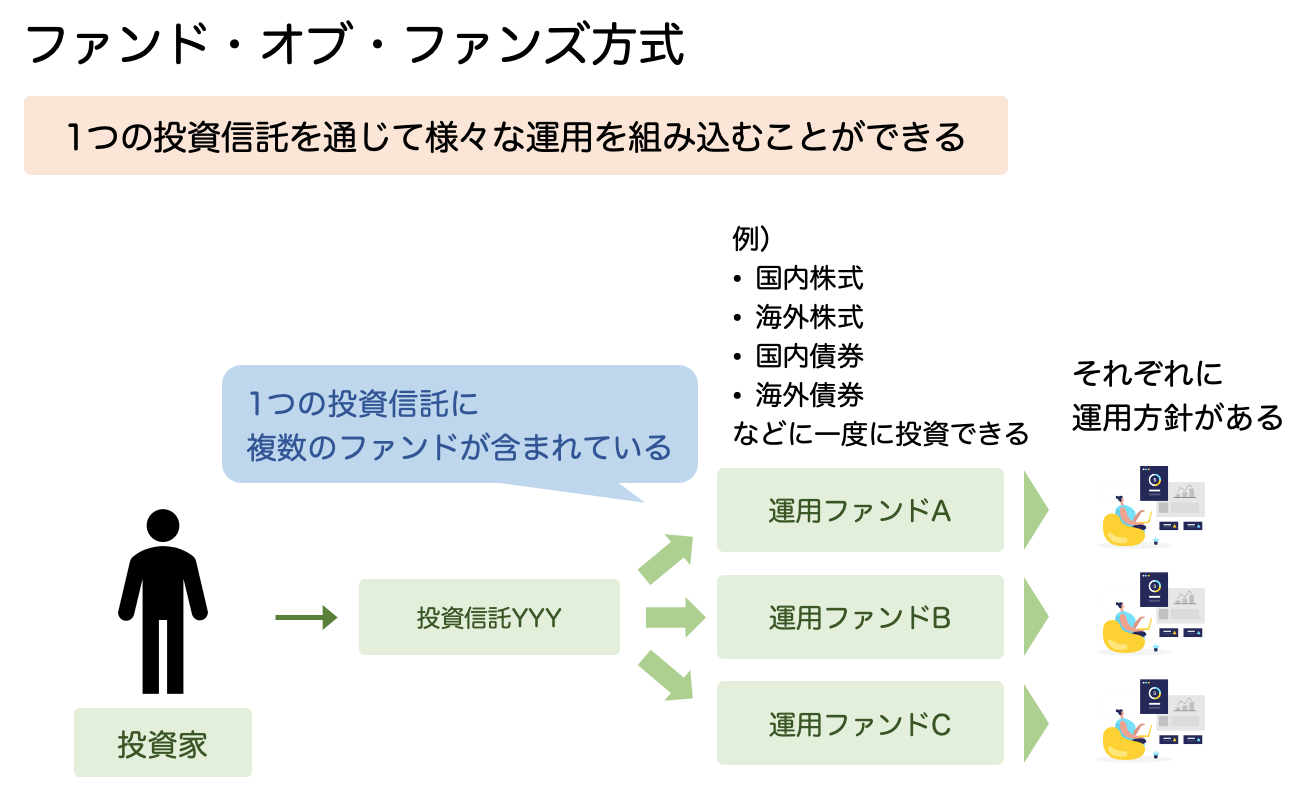 一般的な投資信託は「ファミリーファンド方式」や「ファンドオブファンズ方式」で運用されているものがほとんどです。